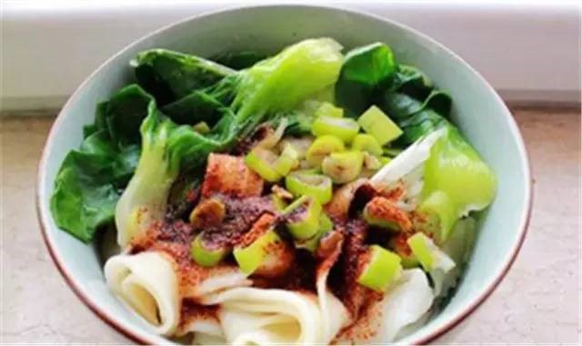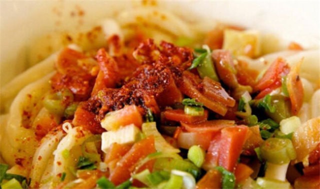 是一種很普通的面食制作方法,將手工制作的面條在開水中煮熟后撈在碗里,將蔥花碎、花椒粉、鹽等配料和厚厚一層的辣椒面一起平鋪在面上,用燒的滾燙的菜油澆在調料上,頓時熱油沸騰,將花椒面、辣椒面燙熟而滿碗紅光,隨后調入適量醬油、香醋即可。