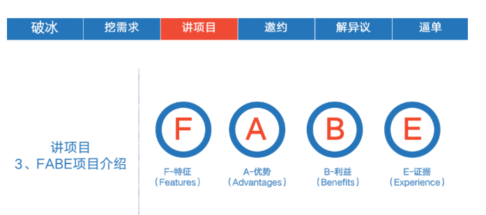 FABE法是招商人員在介紹項目時,將項目或產品的F(Features特征)-A(Advantages優勢)-B(Benefits利益)-E(Experience證據)這四個維度,逐一體現在講項目的話術中,從而打消客戶對項目的顧慮、激發客戶意愿。