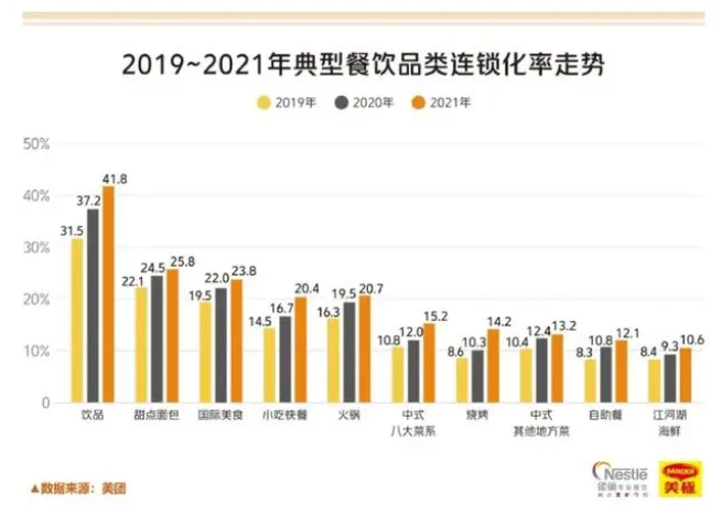 隨著近年國內城鎮化水平不斷提高,消費者生活節奏不斷加快,快餐市場需求也逐步擴大。《2023中國中式餐飲白皮書》數據顯示,2020年餐飲市場營收下滑至39527億元,但連鎖企業門店數量卻持續上升,2021年中國連鎖餐飲門店更是達到41641家。疫情期間連鎖化進度持續加快,大灣區餐飲市場連鎖化率已經高達26%。規模方面,3-10家門店的品牌漲幅最高,同比增長了23%;瑞幸、星巴克、茶百道均在2021年跨入5000+家俱樂部。品類方面,2021年,飲品的連鎖化率最高,連鎖化進程也最快,其次是甜點面包、國際美食等。其中,小吃快餐、燒烤兩大品類的連鎖化增速明顯。
