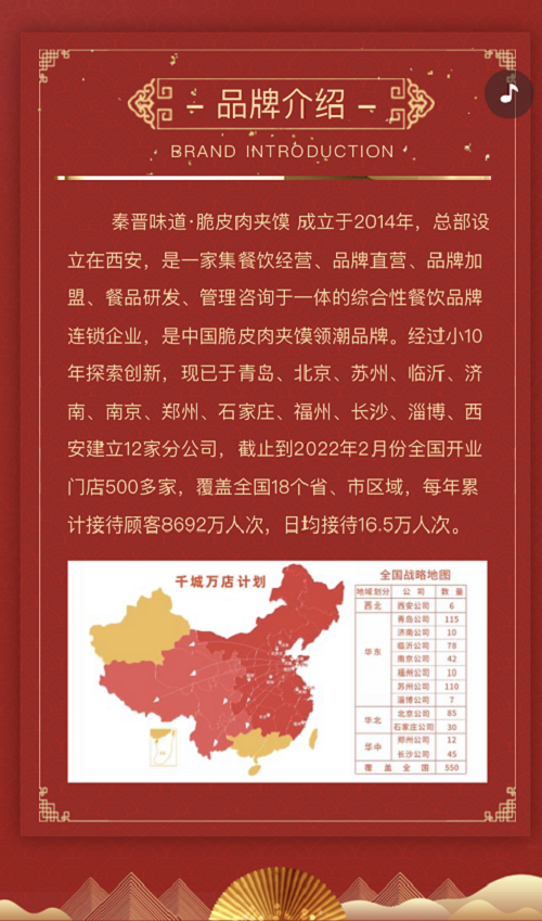 秦晉味道·脆皮肉夾饃 成立于2014年,總部設立在西安,是一家集餐飲經營、品牌直營、品牌加盟、餐品研發、管理咨詢于一體的綜合性餐飲品牌連鎖企業,是中國脆皮肉夾饃領潮品牌。經過小10年探索創新,現已于青島、北京、蘇州、臨沂、濟南、南京、鄭州、石家莊、福州、長沙、淄博、西安建立12家分公司,截止到2022年2月份全國開業門店500多家,覆蓋全國18個省、市區域,每年累計接待顧客8692萬人次,日均接待16.5萬人次。