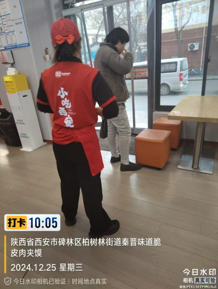 12月25日,早晨的高峰期過后,店里逐漸恢復了平靜。這時,一個大哥走進店里,有些不好意思地說:“我沒有錢,想吃東西可以嗎?”