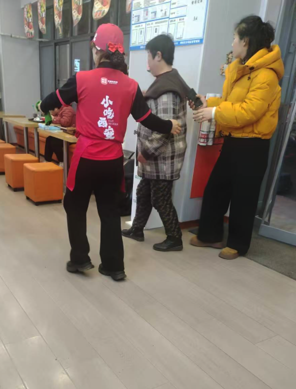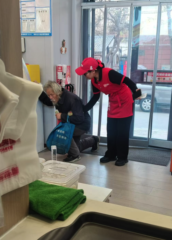 12月26日,清晨的忙碌剛剛平息,大差市店內的張景麗小張正在前廳打掃衛生。這時,一位大爺推開了門,剛進來就跪了下來,嘴里似乎在努力說著什么。小張見狀,趕緊上前扶起大爺,關切地詢問:“大爺,您是不是要吃飯?”
